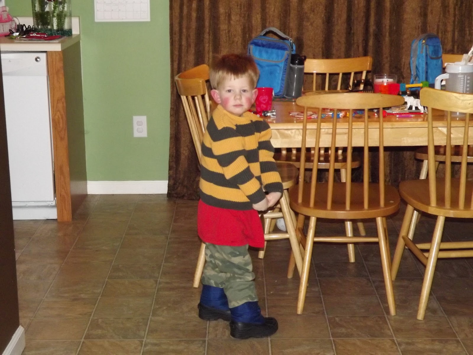 And, here is one of Liam. I love his choice in clothing. He is actually wearing 3 shirts-a long sleeve tshirt, his favorite short sleeve tshirt and a sweater. Paired with camo sweats and snow boots, he is quite the fashion star. I don't know, with his red hair, he kind of looks like a little Irish boy who should be running around taking care of his sheep.